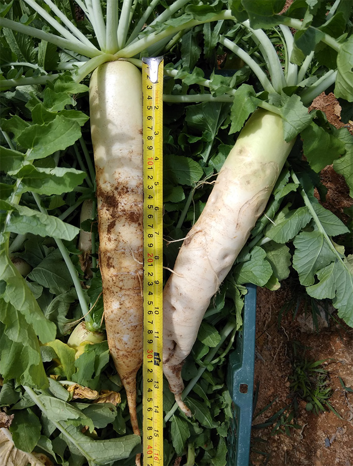 In recent years, there have been numerous fruitful results recorded from the application of Bai Shi Yin Agriculture Technology – trees that were barren for years began to bear fruits and grassless lands could be transformed to enable the cultivation of agricultural crops. An increasing number of Bai Shi Yin Agriculture Technology Research Bases have been established, including China’s Wuyi Mountains Dahong Pao (Red Imperial Robe) Tea Plantation; Beijing Fig Orchard; Fujian Camellia Oil Plantation; Malaysia’s Guang Li Liang Durian Farms, Cameron Highlands Organic Fruit and Vegetable Farms; Singapore’s City Horticulture; and Australia’s lemon trees, etc. August 8, 2018 was a very important and meaningful date. With a group of more than 50 people, Bai Shi Yin Guang Bo held a grand groundbreaking ceremony at Lojing Highlands. The white radish and Pak Choy greens that were cultivated following the ceremony were highly prized items, with demand exceeding supply.