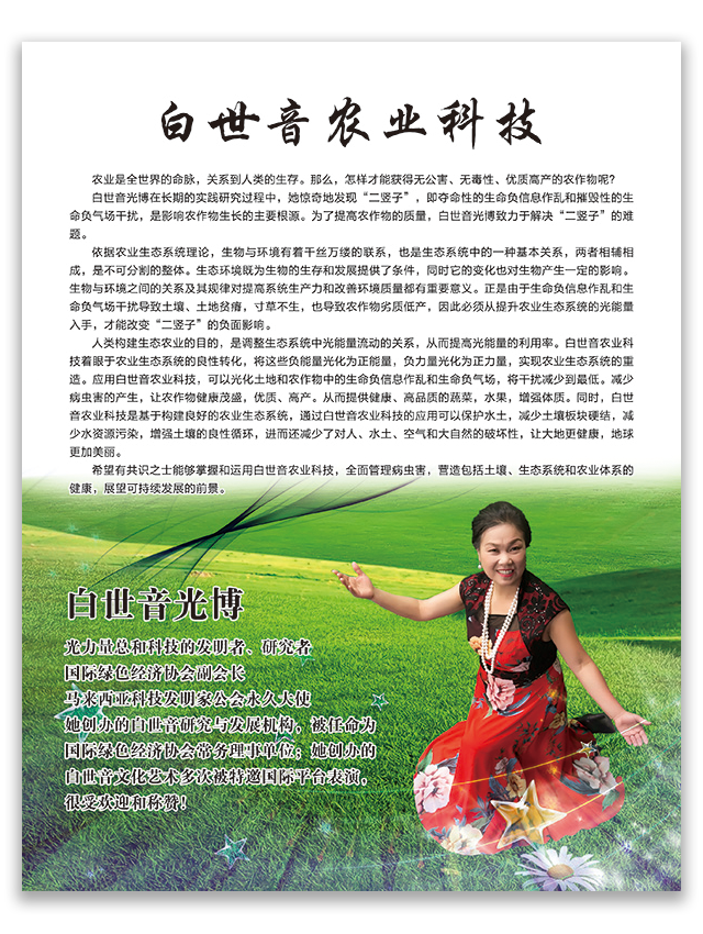 白世音光博在长期的实践研究过程中,她惊奇地发现 “二竖子” ,即夺命性的生命负信息作乱和摧毁性的生命负气场干扰,是影响农作物生长的主要根源。为了提高农作物的质量,白世音光博致力于解决 “二竖子” 的难题。刊登在《中国政协》中的白世音农业科技,重点解答了这个问题。