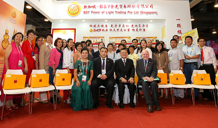白世音光博(前排左一)欢迎联合国原副秘书长沙祖康(右二),联合国全球契约组织高级顾问杜比(右一)和国际绿色经济协会会长邓继海(左二),光临白世音研究与发展机构展位