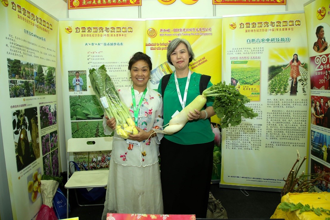 参观白世音研究与发展机构展位的人肯定会注意到柜台展示出的巨大白萝卜。它比一个男性的手臂粗,在展示架上非常显眼。尽管在会展上展出三天,结束时白萝卜仍然看起来很新鲜,它叶子仍然依附着根茎,叶子不切通常是会导致白萝卜很快变质。会场上所展示的萝卜和绿叶蔬菜来自范子祥经营的悟心有机田园。范先生是一名来自马来西亚金马伦高原的农民,他非常信奉无化学的种植。他在他的农场应用了白世音农业创新科技,由白世音研究与发展机构组织位于怡保的志愿者提供支持,他们每两周到访他的农地一次,以确保其遵守适当的时间表和程序。高品质的萝卜能持久的保存,证明了正能量农业的好处。此外,会场所展出的香蕉和甜芒果是白世音农业创新科技在农业中应用所产生的农作物。这也是由有感恩心的协会所提供,该协会位于马来西亚雪兰莪巴生的齐心老人院。这家老人院的居民在他们的院内采用白世音农业科技栽种水果。
